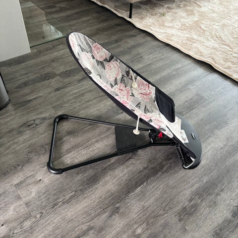 Babybjörn lasten keinu, jossa musta ja harmaa kangaspäällinen.