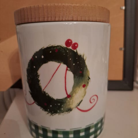 Arabia Joulukranssi -sarjan säilytyspurkki puukannella. Suunnittelija Minna Immonen. Kannessa kuminen tiiviste, on täysin kunnossa. Purkki ei ole ollut käytössä. Voin postittaa , kulut ostajalle. Toridiilikin käy.