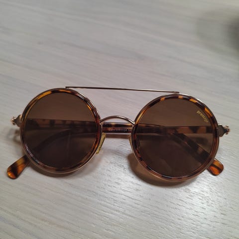 Pyöreät mustat aurinkolasit. Merkki prestige. Pieni ohut naarmu toisessa linssissä joka ei kuitenkaan näy näkökentässä. Laitan salamalla otetun kuvan viimeiseksi.