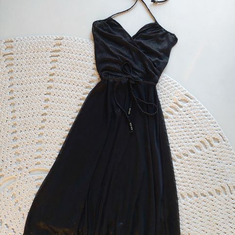 Kangas kiiltää kauniisti. Alusmekossa hiukan tylliä, jotta mekko laskeutuu hieman A-linjaisesti. Kapeat olkaimet, jotka voi halutessaan poistaa. Sivussa vetoketju helpottaa pukemista. Koko vastaa 36 tai pieni 38. Vyötärön leveys 37 cm. Mekon pituus 113 cm (kainalon korkeudella mekon yläreuna).