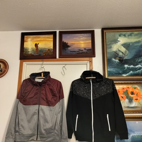 HM kevyt vanuvuori takki, tumma sininen, reunassa trikoo kangas, 15e. Snozu paksu fleece takki 15e