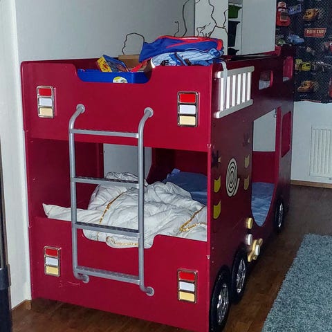 Puinen kerrossänky tikkailla + sängyn alas tuleva liukuva lisävuode/säilytys tila