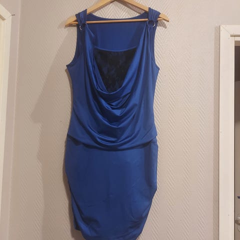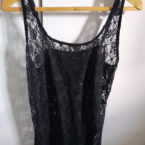Uusi musta toppi/ minimekko, jossa edessä pitsimäinen koristus lilalla pohjalla.