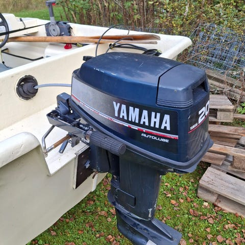 Yamaha 20 perämoottori, ulkoinen moottorityyppi veneisiin. Moottori on harmaa ja punainen, soveltuu pienen tai keskisuuren veneen käyttöön. Varustettu potkurilla ja ohjaustangolla. Sopii monenlaiseen vesiliikenteeseen ja veneilytarpeisiin.