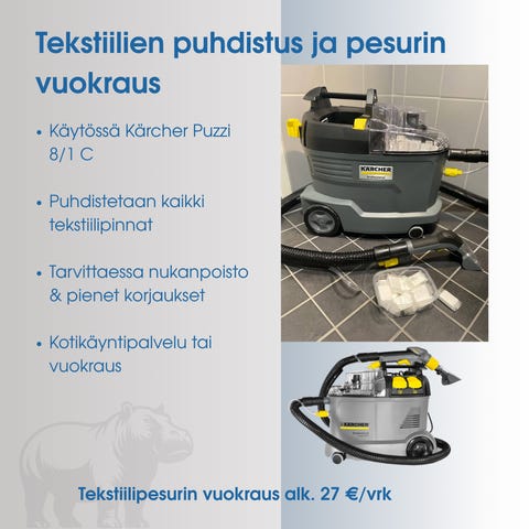 Puhdistan tekstiilipinnat tehokkaasti ammattitason Kärcher-laitteilla (Puzzi 8/1) sekä muilla tekstiilien puhdistusvälineillä ja -aineilla – tuloksena raikas ja siisti lopputulos ilman pitkäaikaista kuivumista.