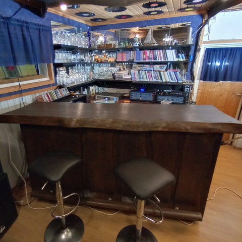 Lasikannella ja valolla varustettu baaritiski. Tiskin vanerirunko vaatisi jonkun vaikka sisustuskiven tai millä haluaakin päällystää. Vain nouto!