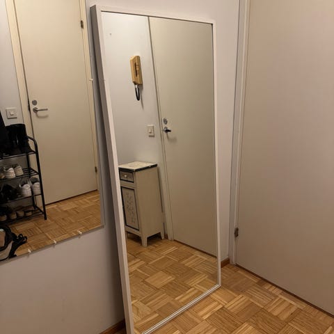Iso, hyvässä kunnossa oleva Ikean peili. Peili on hyvin tukeva, pysyy hyvin pystyssä ilman kiinnitystä. Vahva saa kannettua yksin, muuten omat kantajat mukaan. Peili on rivitalossa jonka ovelle pääsee autolla eli matka ei ole pitkä.😊