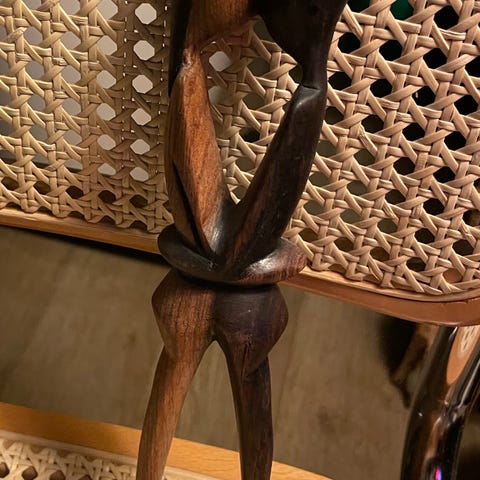 Abstrakti käsintehty puuveistos. Veistos on tummaa puuta ja siinä on yksinkertaiset, mutta ilmeikkäät piirteet. Hahmo seisoo puisella jalustalla.