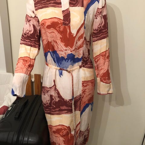 Marimekko mekko, koko 34, väriltään pääosin punainen. Mekossa on lyhyet hihat ja se on valmistettu laadukkaasta materiaalista. Vuori. Jäänyt itsellä kaappiin, mekkojen runsauden takia. Upea mekko vaikka jouluksi itselle tai lahjaksi.