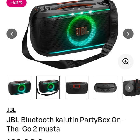 JBL PartyBox kannettava Bluetooth-kaiutin mustalla värillä. Kaiutin on varustettu useilla ohjauspainikkeilla äänen ja toiston hallintaan. Mukana myös langaton mikrofoni. Soveltuu äänentoistoon erilaisissa tilaisuuksissa ja tapahtumissa. Tuotteessa käytön jälkiä mutta kaikki toimii. Jäänyt ylimääräiseksi.