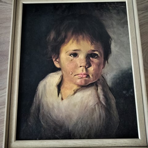 Vanhat Giovanni Bragolinin itkevä lapsi -vaneritaulut.