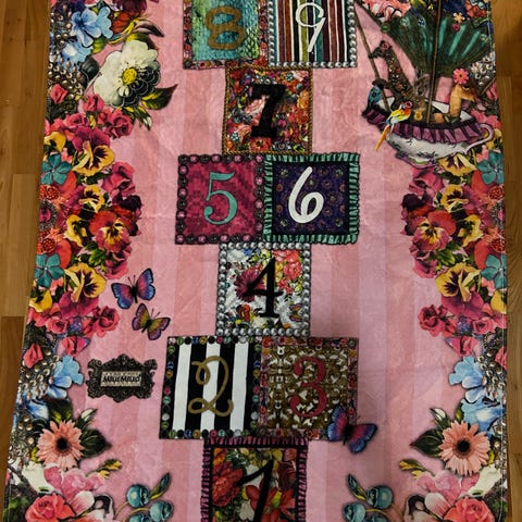 Samettisen pehmeä matto jonka halkaisija 80 cm. Liukumaton kumipohja. Hetken aikaa oli käytössä lapsen sängyn vieressä josta siirretty sellaisenaan varastoon.