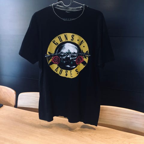 H&M Guns N'Roses t-paita. Koko 40/M. Kai-kai 50. Materiaali lappu puuttuu mielestäni puuvillaa elastaania polyesteriä. Käytetty kunto,nukkaa pinnassa. Yleisilmeeltään ihan siisti kuitenkin. Kamera hieman vääristää väriä luonnossa vaaleampi harmaa.