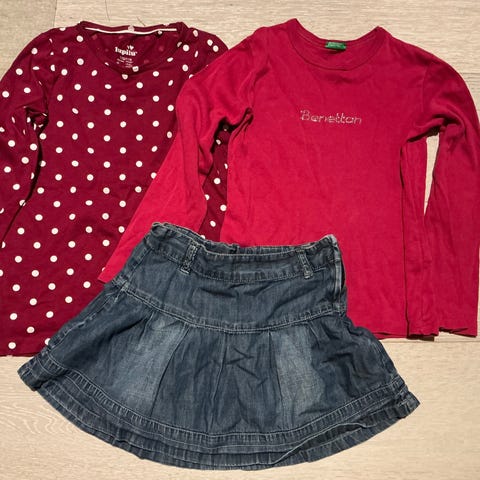 Myydään tyttöjen vaatesetti. Kaksi uutta (ei käytetty) pitkähihaista trikoopaitaa söpöillä kuvilla. Mukaan ehkä muutaman kerran käytetty sininen ”farkkuhame” joustavaa collegemaista materiaalia. Hameessa säätövyötärö, kiva leggareiden tai sukkahousujen kanssa.