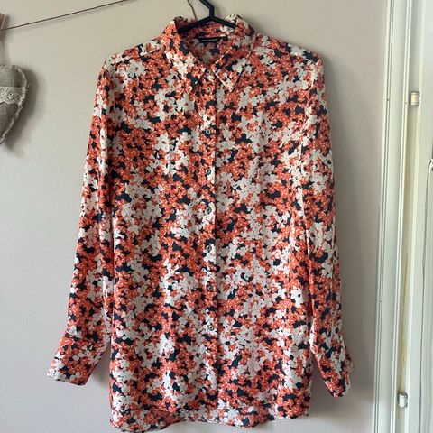 Marimekko Minea Torstai monivärinen (sininen, oranssi jne.) silkkipaita, koko 38. Paita 100 % silkkiä, metalliset napit.
