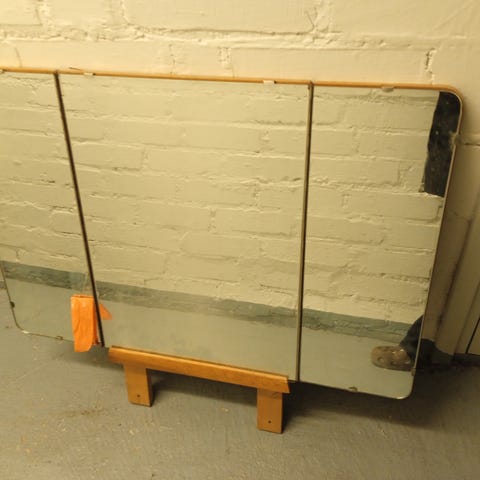 Kuvista poiketen vain toinen sivupeili ehjänä. Mukaan saa peiliä joista saa leikkautettua oikean kokoisiksi: keskelle ja toiselle sivulle.
