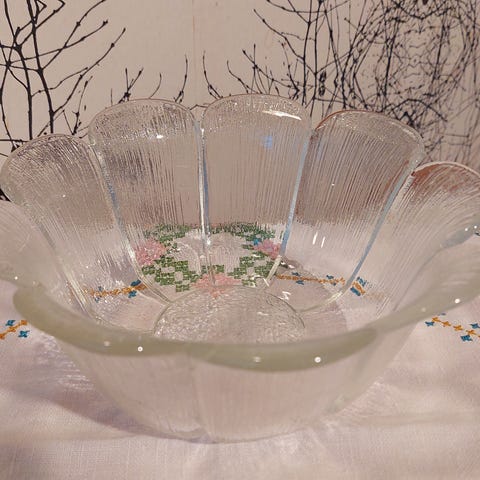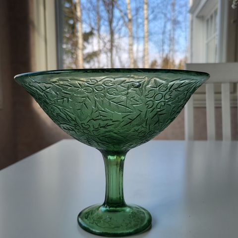 Kukalliset, kullankeltaiset lasimaljat, tarjoiluastiat. Joitakin haaleita lusikan tms naarmuja. Lasissa myös pieniä ilmakuplia siellä täällä.