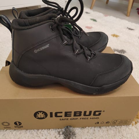 Siistit Icebug Lien M -nastakengät, joilla pysyt paremmin pystyssä liukkailla. Koko 45. Meillä jäivät nopeasti muksulta pieneksi, kun jalka kasvoi. Kuten kuvasta näkyy, pohjatkin ovat hyvässä kunnossa.