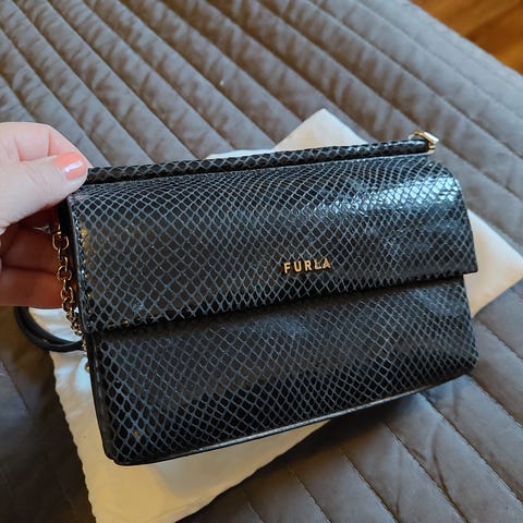 Tyylikäs, mustaa pehmeää nahkaa oleva Furlan klassinen iltalaukku. Koristeet ja hihna metallihelmiä.