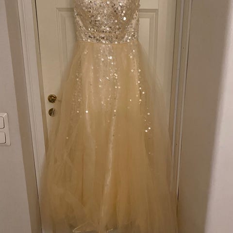 Ilta- tai juhlapuku. Mekossa on kukkakuosi ja lyhyet hihat.