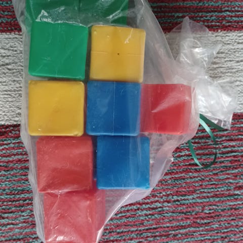 Clementoni pehmeitä palikoita 10 kpl. Koko n. 4,5 x 4,5 cm, isompi palikka n. 4,5 x 10,5 cm. Naarmua ja pientä käytönjälkeä, joka ei vaikuta käyttöön. Keränneet hiukan pölyä. Muita vikoja en huomaa.