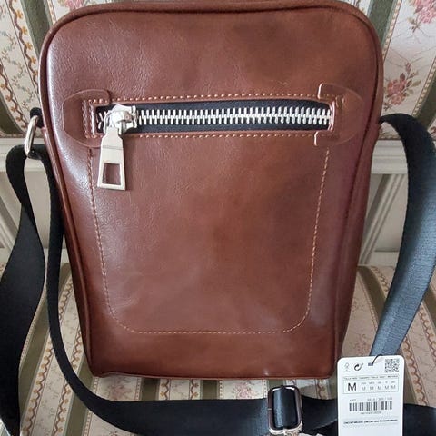 Myynissä uusi ja käyttämätön ruskea miesten olkalaukku.