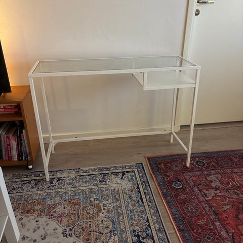 Myyydään lasinen työpöytä 160 x noin 80 cm. Säädettävät jalat, pöytälevy paksua lasia. Painava. Sijainti: Kangasala, Ruutana. Nouto