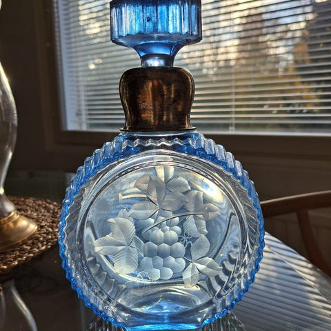 Kaunis neliskanttinen lasikarahvi, tuoksuton. Ilmeisesti viskikarahvi.