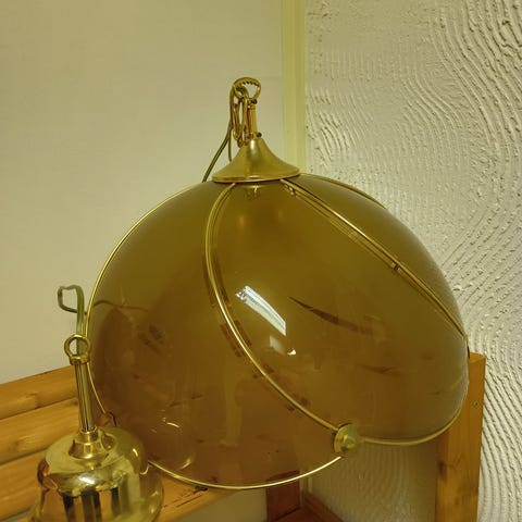 Upea kattovalaisin, kultapäällysteinen, jossa roikkuvia kristalleja. Koko valaisimen korkeus 55cm ja leveys 55-60cm. Valaisimessa on kahdet kuvut, vaaleat jotka kuvassa ja tumman ruskeat lisäksi. Valaisin on 1970-80 luvun vaihteesta.