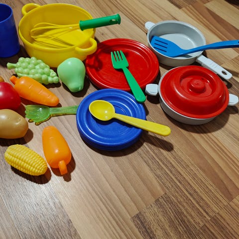Myydään lasten leikkiruokasarja muovia ja muutama astia posliinia