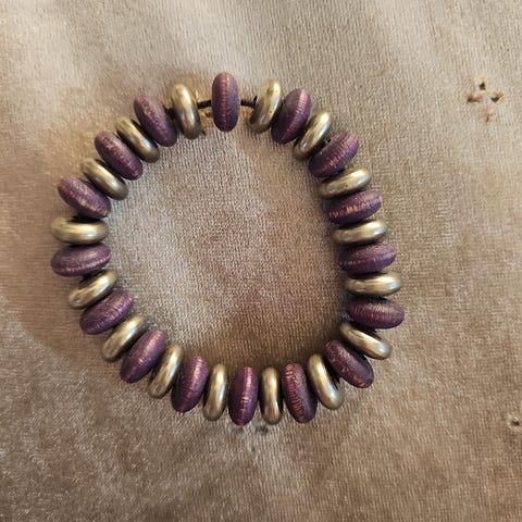 Aarikan luumun värinen rannekoru jossa metalliosia. Myytävänä myös muualla.