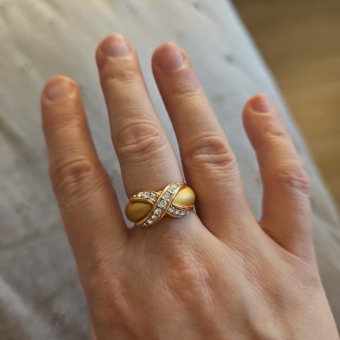 Hopean värinen sormus kirkkaalla kivellä. Koko n 18 (8). Myytävänä myös muualla.