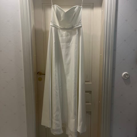 Myydään kerran käytetty, Stockmannin White Dressiltä ostettu Eva Lendelin Jess -häämekko ja lisälaahus. Kokoa 42 molemmat, Eva Lendelin kokotaulukossa taisi olla 44-46. Olen itse 160 cm ja minulla oli reilu 5 cm korot hääpäivänä, joten menee arviolta 165 senttiselle. Lisälaahus on pitkä, noin kolme metriä. Pesetetty pesulassa, ei pitäisi olla mitään tahroja.