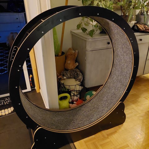 Ammattikoululla teetetty. Kevyt pyörimään. Soveltuu isommallekkin kissalle.