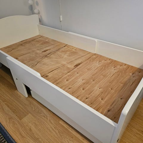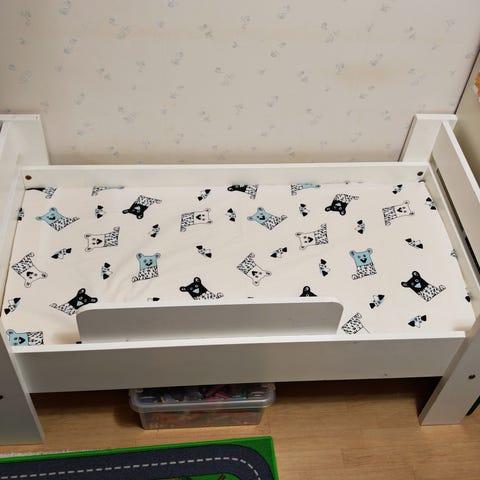 Annetaan työpaikalta lapsen sänky ja sängyllä olevat peitot ja tyynyt. Sänky kohtuullisen tukevan oloinen, taustalevy vähän irrallaan. Nouto Tapiolasta.