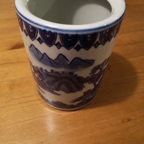 Kannellinen ehjä posliininen purkki. Siniset kuviot ja teksti " Teetä" valkoisella pohjalla. Korkeus 17 cm, leveys edestä levein kohta 11 cm ja levein kohta sivusta 9 cm. Kätevä purkki koristeeksi tai säilytykseen. Koristeena pidetty, joten on muuten käyttämätön ja siisti.