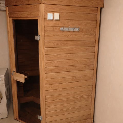 - Pieni, tilava ja valoisa sauna ergonomisilla lauteilla, mitoitettu 1-2 hlölle.