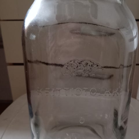 Karhula lasipurkki, tilavuus 5 litraaa valmistettu kirkkaasta lasista. Purkissa on sininen kansi, jossa on Karhula-logo ja karhukuva. Ollut koristeena kaapin päällä.