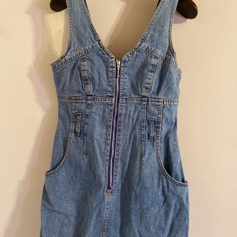 Joustavaa kangasta oleva harmaa farkkumekko. Puffihihat. Vetoketju takana. Kissa/koiratalous
