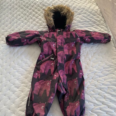 Haalari on ollut käytössä yhdellä lapsella yhden talven. Ei kulumia, käytetty vain rattaissa ja kunnon lumikeleillä, joten kangas on todella siistissä kunnossa. Vain vetoketjuun ja vetoketjun pidikkeen heijastimeen on tullut kulumaa. Vetoketjua tikattu parilla pistolla, toimii edelleen. Jalkalenkit siistit.