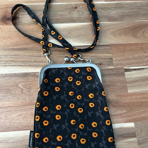 Erittäin siistikuntoinen pieni Marimekon olkalaukku. Pohjaväri tumma lila. Korkeus noin 13 cm ja leveys noin 17 cm. Erotuksena nyt myynnissä oleviin kukkarolaukkuihin tässä on tasainen pohja, joten sisältä huomattavasti tilavampi.
