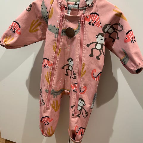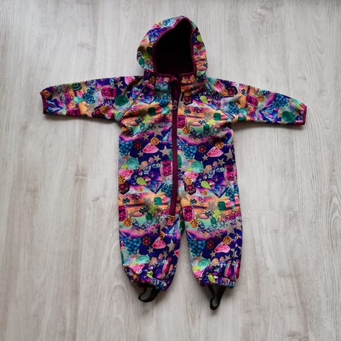 Jonathan 74 lasten haalari, väriltään kirjava. Haalari on unisex-mallia ja sopii lapsille, joiden koko on 74. Hihan resorit vähän nukkaantunut.