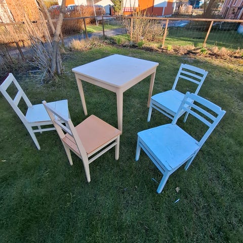 Ruokapöytä ja tuolit+ nojatuoli+ pesukone+ matot+ lipasto +peili