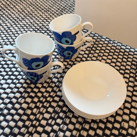Marimekko Unikko- kahvikupit, aluslautaset ja leipälautaset