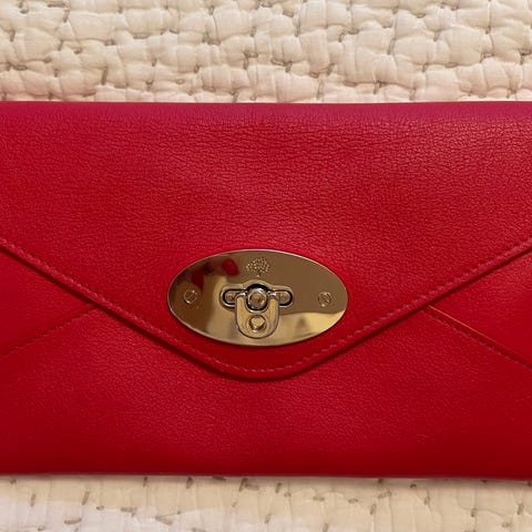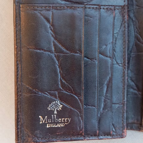 Mulberry nahkainen lompakko, oranssin värinen. Lompakossa on useita korttipaikkoja, vetoketjullinen kolikko-osasto ja napillinen suljenta. Vetoketjusta puuttuu yksi osa, näkyy kuvissa. En tiedä onko aito.