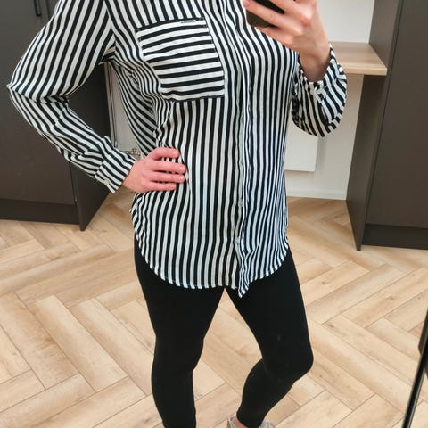 Mustavalkoinen raidallinen pusero H&M:ltä koossa 42. Edessä napit, samoin hihansuissa. Erinomainen siisti kunto!