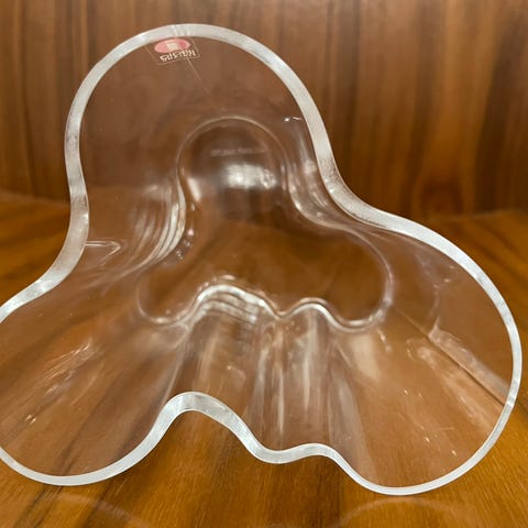 Iittala Alvar Aalto maljakko kirkkaasta lasista. Maljakolla on aaltoileva muotoilu, joka on tunnusomainen Alvar Aallon suunnittelulle. Materiaali on läpinäkyvä lasi. Sopii kukkien tai koriste-esineiden esillepanoon.