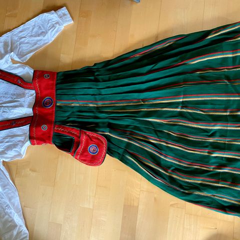 Orimattilan naisen kansallispuvun liivihame ja tasku.