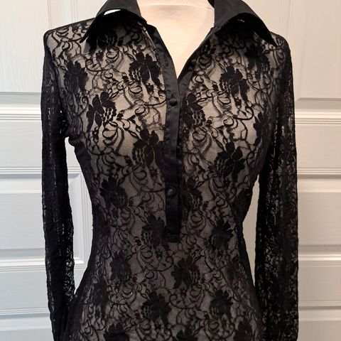 Musta pusero , juhlava pitsineulos. Jämäkkää, kestävän oloista materiaalia (jokin tekokuitu).