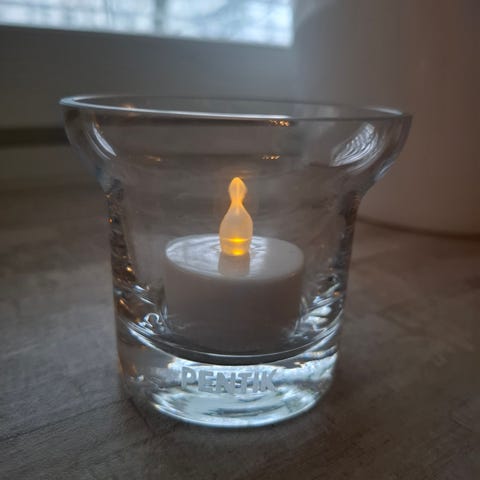Keraaminen kynttilälyhty arviolta 90-luvulta tai vanhempi. Pentikin Halla-tyylinen, mutta en usko tämän olevan Pentikin, ei ainakaan leimaa pohjassa. Pilkullinen kuosi vain osassa lyhtyä, osittain tasaisen valkoinen. Ehjä, lyhdyn suussa kuitenkin muotoiluvaiheen kauneusvirhe (kuva). Sisällä vähän steariinijämiä.